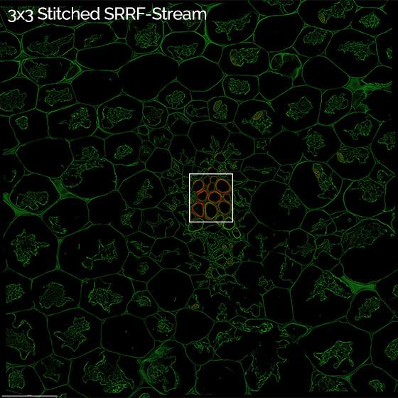 結(jié)合SRRF-Stream?和Stitcher?,可以對(duì)目標(biāo)樣本大于物鏡視野的樣本進(jìn)行高分辨率成像。