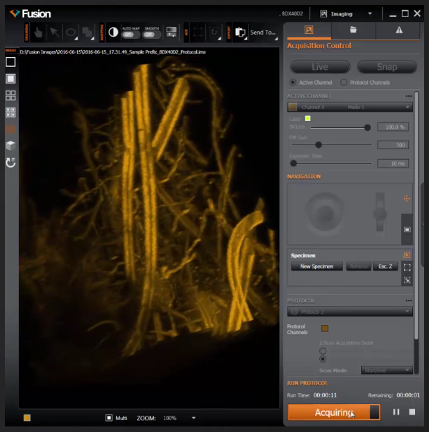 對(duì)樣本的3D屬性有近乎瞬時(shí)的反饋,這對(duì)于評(píng)價(jià)研究實(shí)驗(yàn)參數(shù),包括信噪比、光照功率和樣本生存能力,以及該參數(shù)在3D中的位置和它與臨近細(xì)胞或組織的關(guān)系是至關(guān)重要的。渲染的質(zhì)量和速度可以根據(jù)您實(shí)驗(yàn)中的變化迅速調(diào)整,并可輕易通過(guò)Fusion軟件的控制面板進(jìn)行訪問(wèn)。